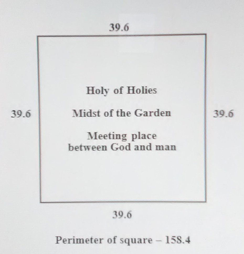 The Holy of Holies in the Temple was 39.6 feet on each side, making the perimeter 158.4 feet, suggesting that the center of the earth, the Holy of Holies, the Midst of the Garden, occupied a surface square whose perimeter was 158.4 feet.